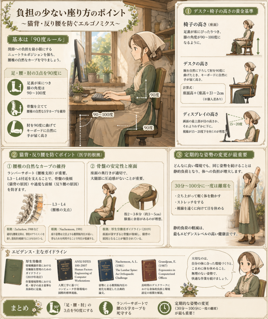 厚生労働省のガイドラインでも、椅子や机は作業者の姿勢に合わせて調整することを優先するよう示しています。つまり、気合いじゃなくてセッティングが大事、ってことです。